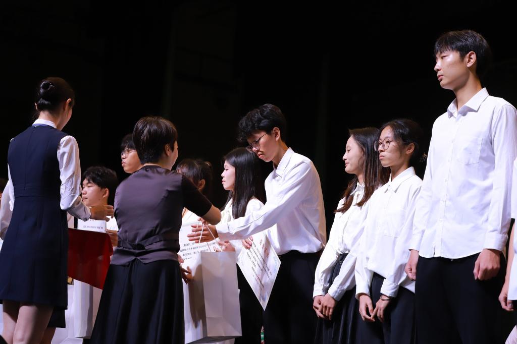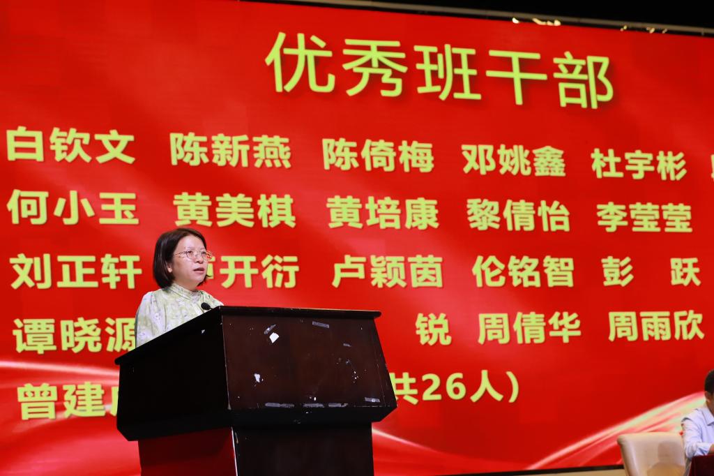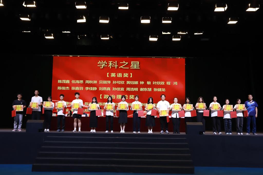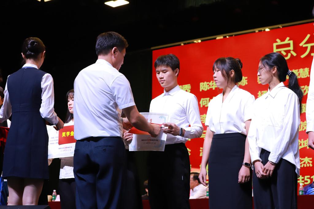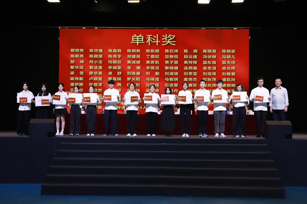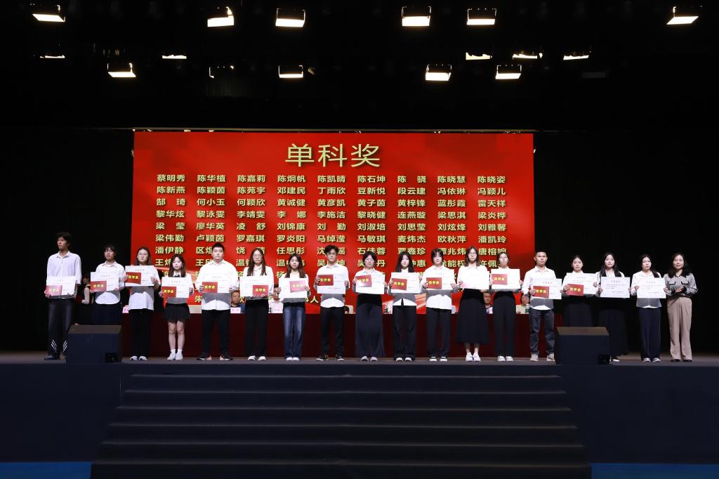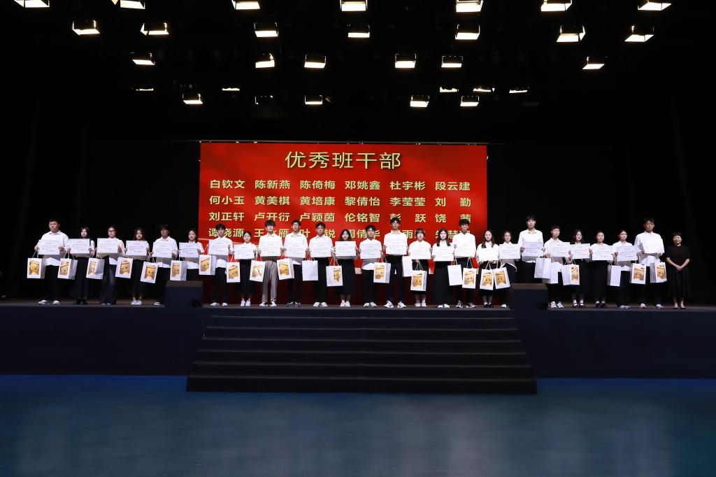 在表彰环节,周钦青宣读了2024-2025学年度奖学金及优秀学生干部评选结果。本年度共有51人获总分奖学金、94人获单科奖学金,其中31人获双奖;26名同学被授予“优秀学生干部”荣誉称号。罗丹等领导嘉宾为获奖学生颁奖,现场掌声如潮,气氛庄重而热烈。大会同时对2025年普通专升本辅导班入学测试成绩优异者予以表彰,树立勤学善思的典范。