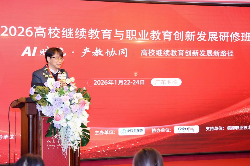 1月22日至23日,由全国高校现代远程教育协作组指导、中教全媒体主办、我校承办的“2026高校继续教育与职业教育创新发展研修班”在顺德仙泉酒店举办。本次研修班以“AI赋能・产教协同:高校继续教育创新发展新路径”为主题,汇聚全国教育界专家学者与行业精英,共同探讨数字化转型与智能化升级背景下继续教育的发展新方向。作为本次研修班的承办与支持单位,学校为活动的顺利开展提供了高水平的组织与服务保障。