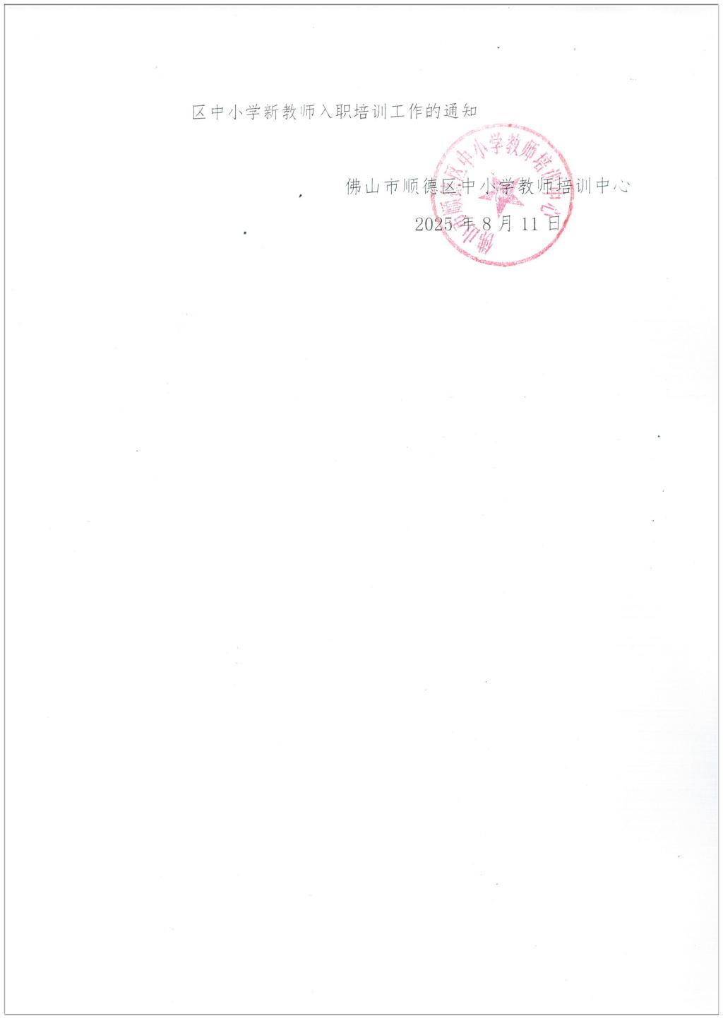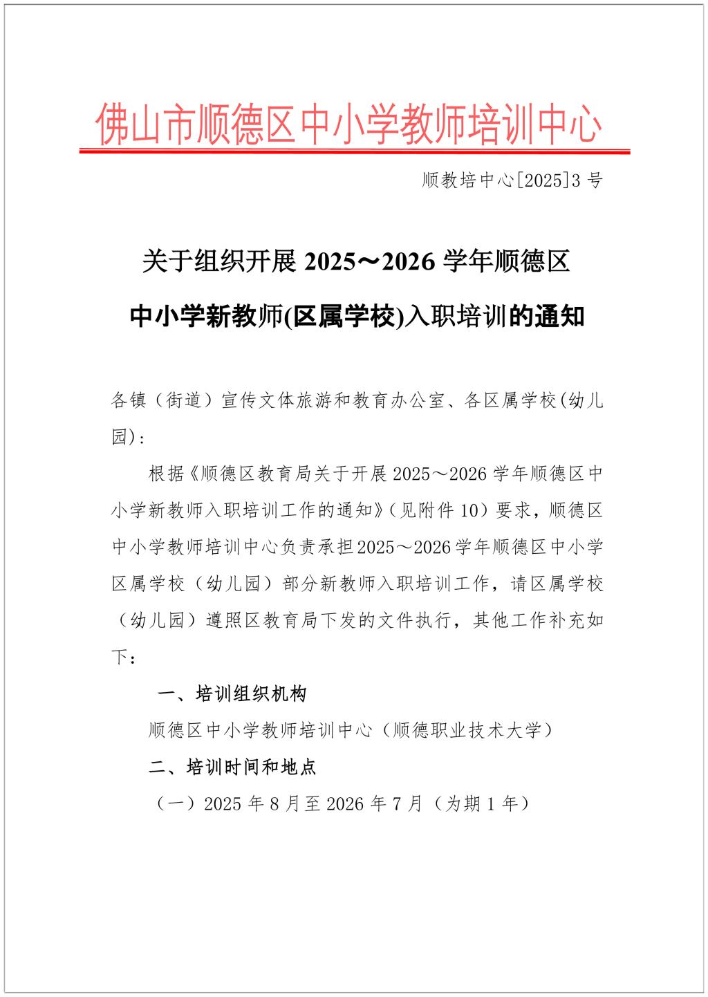 佛山市顺德区中小学教师培训中心关于组织开展2025~2026学年顺德区中小学新教师入职培训(区属学校)的通知