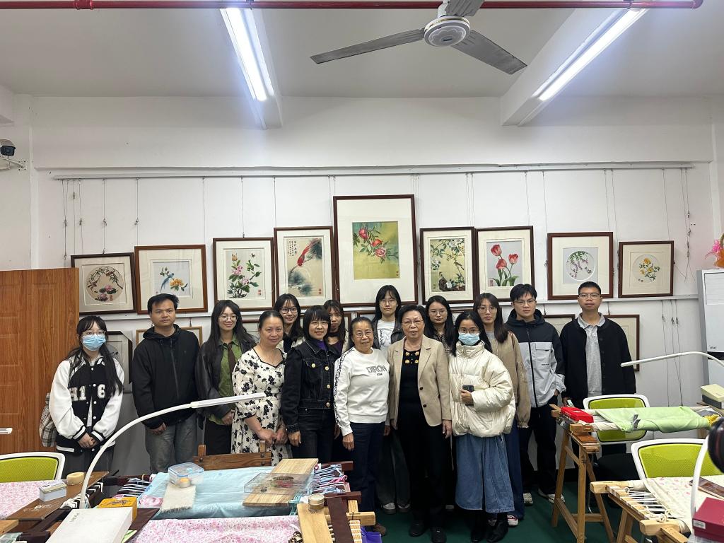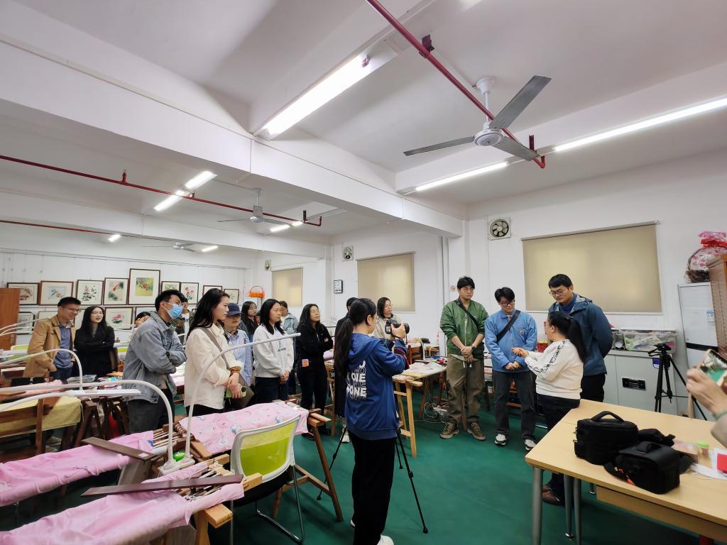 随后,广绣非遗传承人曾剑琴、曾剑仑姐妹带来“零距离”刺绣教学。两位传承人展示了曾氏针法的精妙——如何把普通的丝线分成64丝、120丝,在广绣技艺中,64丝等于一根头发分开十几条,肉眼也难以看清,新教师们纷纷赞叹传承人的高超技艺。